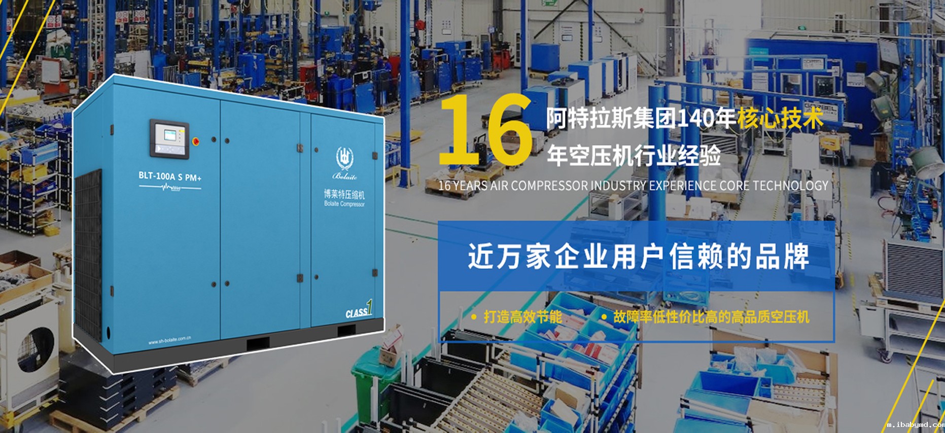 自1999年成立之日起,博莱特专注于螺杆式空气压缩机的设计、生产和销售,以持续的技术创新和高品质的产品、服务。2006年,博莱特被全球顶尖空压机供应商阿特拉斯·科普柯集团全资收购,在集团公司的支持下,现已成为中国空气压缩机行业的驰名品牌。承袭集团先进的技术、设备及生产管理模式,博莱特广受赞誉,并被广泛应用于机械、钢铁、矿山、化工、纺织、汽车、环保、新科技能源等多个领域。