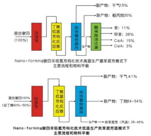 NF工艺采用炼化企业的副产品—碳四(简称C4)裂解气来生产富苯混芳和贫苯混芳,同时联产粗丙烷或粗丁烷,在生产富苯混芳时还副产富氢干气。富苯混芳通过抽提可以得到优级纯苯、优级甲苯和混合二甲苯等化工原料;贫苯混芳适合于作欧IV欧V汽油的调和组分,其辛烷值可达97且基本不含硫,在市场上很畅销。联产品粗丙烷可作为丙烯原料或用于调制车用液化气;粗丁烷可用于生产乙烯、丙烯和异丁烯等低碳烯烃;富氢干气可用于制氢、蒸汽裂解制乙烯或作为燃料气、城市煤气使用。
