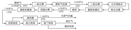 原料气经分离-压缩-脱水-过滤-增压-冷却-脱乙烷最后得到稳定高纯度的液态轻烃-混合碳四,作为生产最终产品——苯、甲苯、BTX和高辛烷值清洁汽油调和添加剂的主要原料。