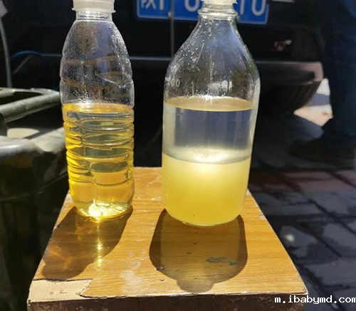 正常汽油(左)与涉事加油站汽油(右)对比。图片来源:极目新闻