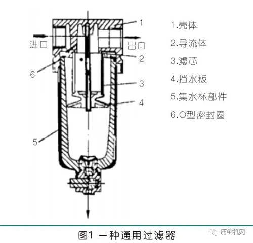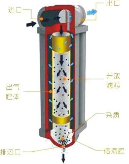 其过滤过程是,压缩空气进入过滤器后由弯曲的导流板引导做螺旋运行,产生的离心力将所含的大粒径固体颗粒和液态水滴向外抛掷,撞向集水杯内壁,并在重力作用下跃落,越过挡水板落入集水杯中,挡水板将污液分离并防止喘流的空气将污液二次带到下游,然后压缩空气从外向内通过滤芯,滤除细小的固体微粒,最后清洁空气从滤芯中心经过过滤器出口排出。