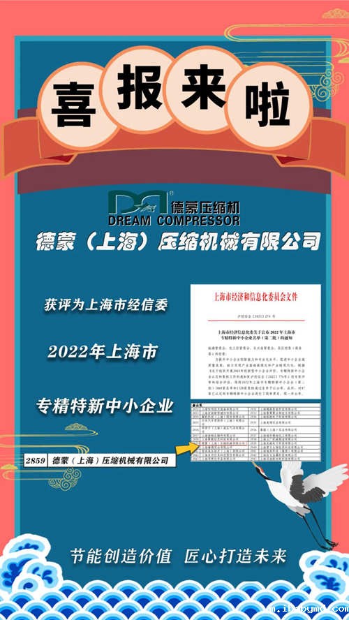为提升中小企业创新能力和专业化水平,促进中小企业高质量发展,助力实现产业基础高级化和产业链现代化,近日,上海市经信委公示了“2022年上海市专精特新中小企业”名单。德蒙(上海)压缩机械有限公司名列该榜单。