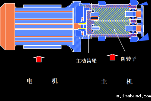 2. 阴、阳转子分别通过各自的从动齿轮与电机驱动的主动齿轮相互啮合,从而传递转矩。