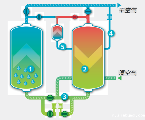 干燥的压缩空气通过节流孔板(4)膨胀后送入外部加热器(5)中。 经过加热后的热空气流经饱和干燥剂(2),从上至下使干燥剂与 其吸附水强制分离。