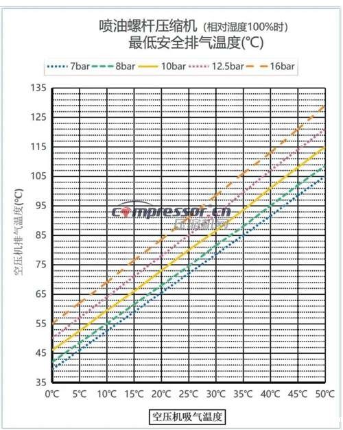 在常压(0.7~0.8MPa)空压机中,排气温度通常在70~90℃之间。尽管理论上等温压缩过程可能比绝热压缩效率更高,但实际中压缩机的最高效率仍略低于绝热压缩。因此,压缩机效率通常与绝热压缩而非等温压缩相比较。如果喷入足够的润滑油并保持低温,排气温度甚至可能低于进气温度。同时,排气温度也有下限要求,以防止压缩后的水蒸气冷凝。在100%相对湿度下,从20℃环境温度压缩到0.8MPa时,饱和温度约为59℃。为防止冷凝水产生,排气温度通常不低于70℃。一旦在系统中出现冷凝水,应将压缩机停车5-6小时,让油与水充分分离并排放水分,否则会使油质恶化并降低润滑油、过滤器、轴承等配件寿命。