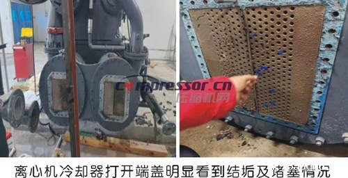 1、山东某化工行业三台315kW水冷型螺杆空压机,采用开式冷却塔降温冷却,和其他生产设备共用一套冷却塔,源水采用地下水作为补充水。化验循环水质,硬度1250mg/l,电导率3680us/cm,PH值8.5,泥沙含量大,结垢频繁,换热器堵塞严重,平均每三个月需拆开换热器清洗一次,夏季更是频繁高温报警,用户苦不堪言。