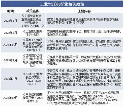 空气压缩机属于国家鼓励发展的节能装备,行业的发展对于国家降低能源消耗、改善环境及实现可持续发展战略目标具有重大意义。近年来国家先后颁布了一系列文件指导和支持本行业,鼓励行业发展,有利于工业空气压缩机行业保持持续发展态势。