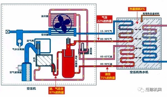 压缩机热能热水机组是将高温循环油(和高温压缩气体)引入热能热水机组内,空压机运行过程中所产生的热能被热能热水机充分吸收,同时压缩机得以降温。