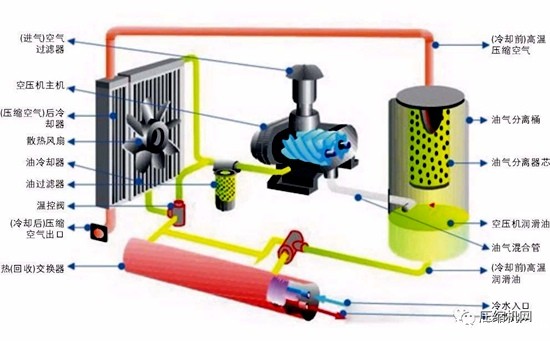 机械螺杆的高速旋转,同时也摩擦发热,这些产生的高热由空压机润滑油的加入混合成油/气蒸汽排出机体,这部分高温油/气流的热量相当于空压机输入功率的1/4。它的温度通常在80℃(冬季)-100℃,(夏秋季)这些热能都由于机器运行温度的要求,都被无端地废弃排往大气中,即空压机的散热系统来完成机器运行的温度要求。