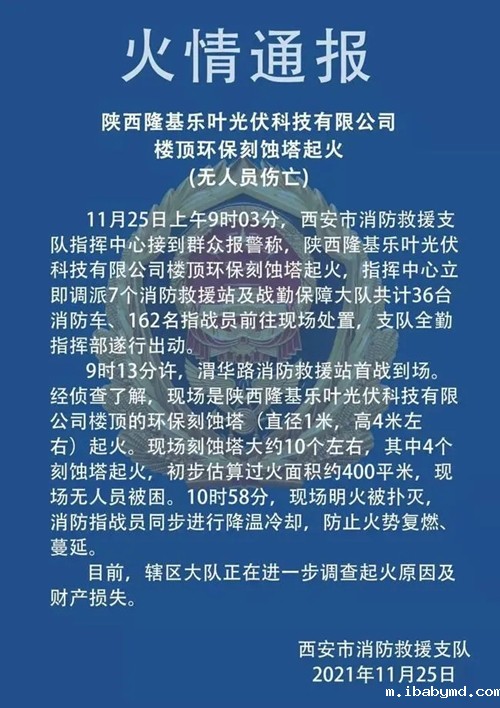 2021年11月,陕西隆基乐叶光伏科技有限公司101厂房浓烟滚滚。据悉,这次失火烧毁厂房和生产设施,过火面积超过10000平方米,属于重大火灾事故。