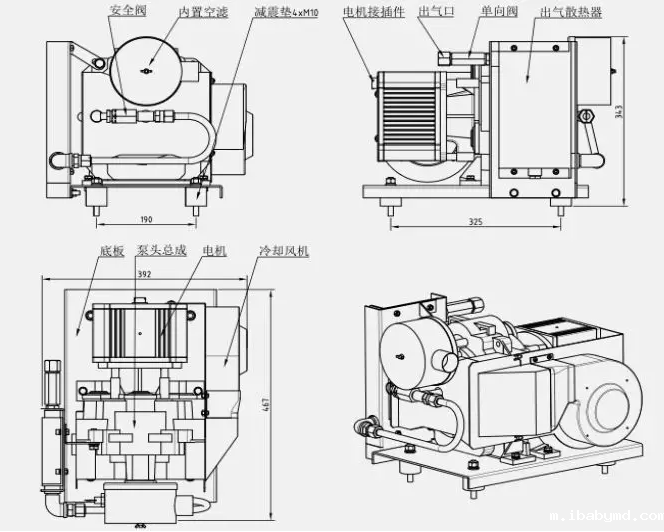 在介绍完无油涡旋式压缩机工作原理后,我们一起来看看无油涡旋式压缩机的主要组成部分:电机、压缩机机体、空气滤清器、排气管、单向阀、安全阀、接头、散热风扇、排气阀岛和底盘组成。