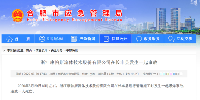 据合肥应急管理局消息:2020年3月29日18时左右,浙江康帕斯流体技术股份有限公司在长丰县进行管道施工时发生一起爆炸事故,造成一人死亡。
