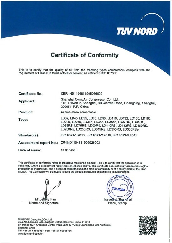 康普艾D系列无油螺杆机通过德国TÜV Class 0无油认证