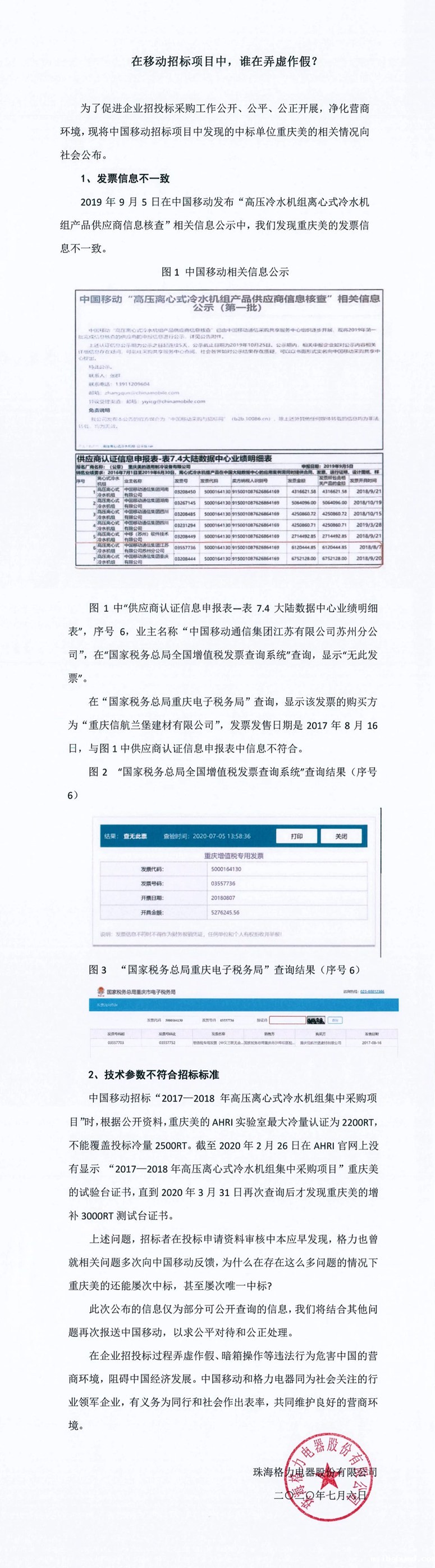 2019年9月5日在中国移动发布“高压冷水机组离心式冷水机组产品供应商信息核查”相关信息公示中,我们发现重庆美的发票信息不一致。