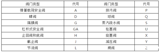 阀门类型代号用汉语拼音字母表示,按表l 的规定表示。