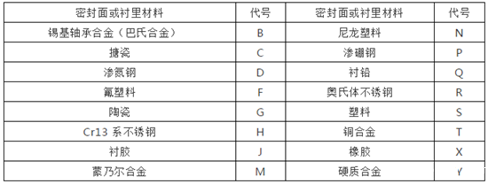 5.密封面或衬里材料代号除隔膜阀外,当密封副的密封面材料不同时,以硬度低的材料表示。阀座密封面或衬里材料代号按表16 规定的字母表示。