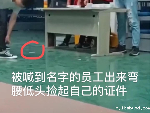 三名分发证件的管理人员不停地念出员工的名字,然后将一张一张证件全部丢在地上,每一个需要领证件的员工都要走在他们面前低头弯腰,像鞠躬一样捡起证件。
