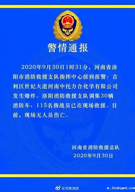 9月30日1时31分,河南省洛阳市消防救援支队指挥中心接到报警:吉利区世纪大道河南中托力合化学有限公司发生爆炸。洛阳消防救援支队调集30辆消防车、115名指战员已在现场救援。目前,现场无人员伤亡。