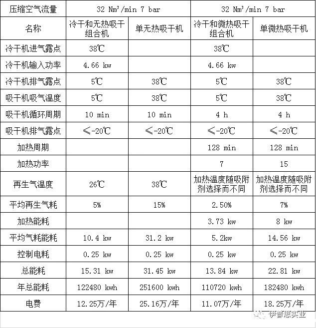 参照表3,我们以32Nm³/min压缩空气处理量为例,列出选择不同机型时的机器运行参数和转化的功率消耗。可以看出采用组合干燥机的空压机系统的再生流气量和加热功率(仅限于微热吸干机)总消耗相差要低很多。