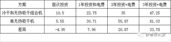 表4 :冷干和无热组合机和单无热吸干机对比 –单位万元