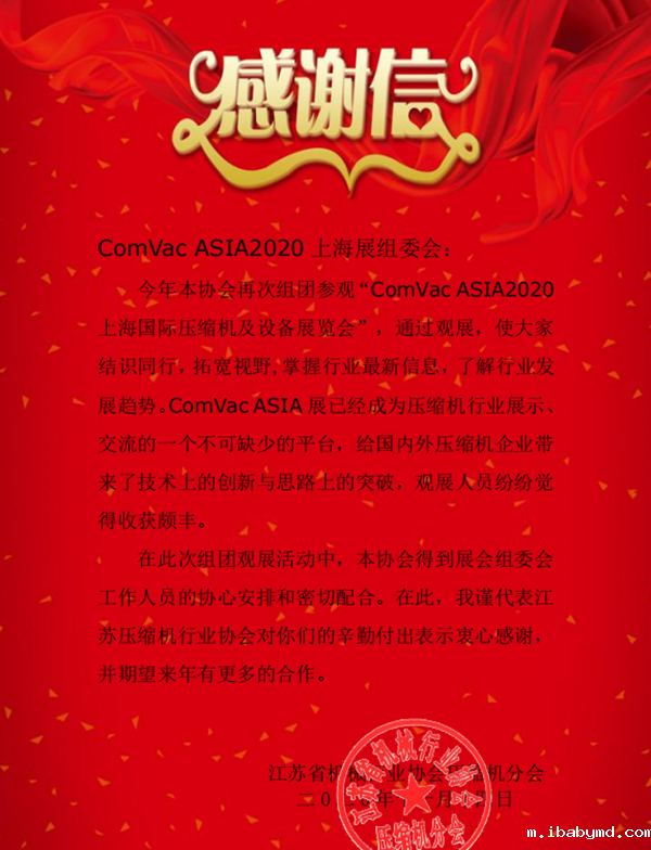 江苏省压缩机分会对ComVac ASIA2020 上海展组委会的感谢信
