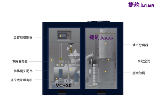 捷豹永磁螺杆真空泵VC系列是全新一代智能型螺杆式真空泵,采用IP65八级永磁电机同轴传动,超低噪音,机头经过长时间模拟测试以及型式试验甄选,技术含量达到业内领先水平。