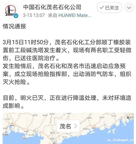 3月15日11时50分,茂名石化化工分部顺丁橡胶装置前工段碱洗塔发生着火,现场有两名职工受轻微伤,已送往医院治疗。