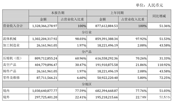2021年,随着疫情的在大陆的稳定,整个制造业越发景气。同时随着工业水平的不断提升,以及我国节能环保相关政策日益严格,对空气压缩机设备的需求也在不断提升。整个空压行业在2021年上半年业绩非常景气。汉钟精机在整个行业成长的大环境下,空压产品上半年也是收获了一定幅度的成长。