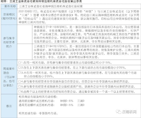 今年7月份,国家市场监管总局反垄断局发布了一批无条件批准经营者案例,无条件批准三浦工业株式会社收购神钢压缩机株式会社股权案。