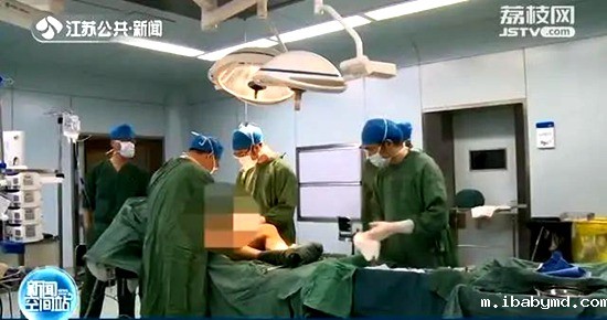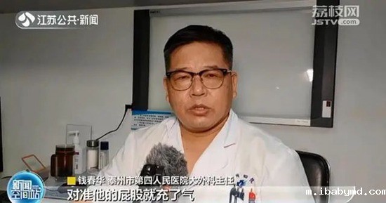 泰州市第四人民医院大外科主任钱春华:“他的话,是在上班的时候同事开玩笑,用这个充气泵(高压气枪)对准他的屁股充了气,导致病人的直肠乙状结肠破裂。”