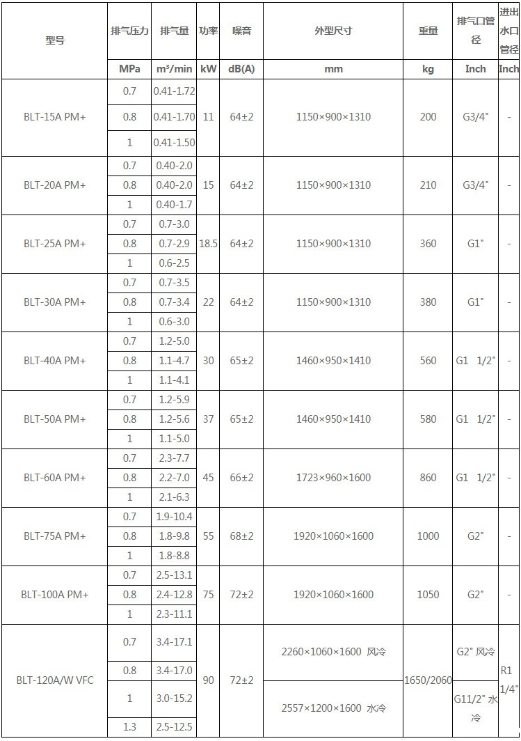 BLT变频系列(11-90kW) l 获益于140余年的历史传承和技术经验。 l 利用欧洲集团公司总部在空气压缩机上的杰出的设计能力和丰富的经验,遵循欧洲集团严格的开发流程及测试标准,针对中国各种复杂气候及恶劣工况进行加强设计,确保每台BLT系列空气压缩机得到可靠的质量保障。